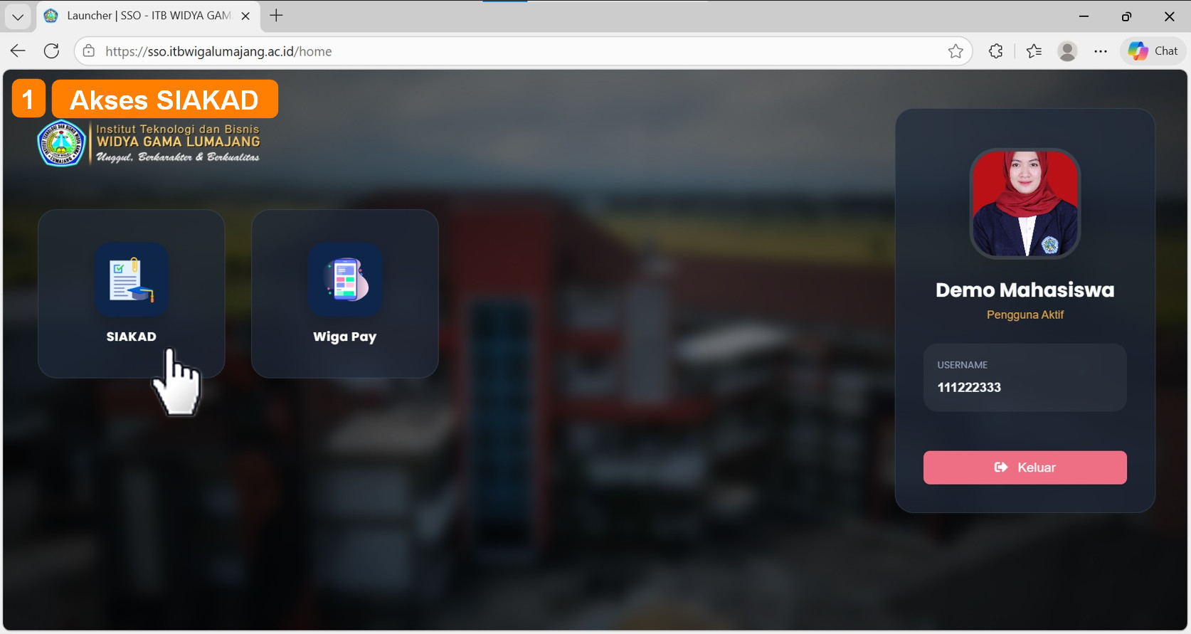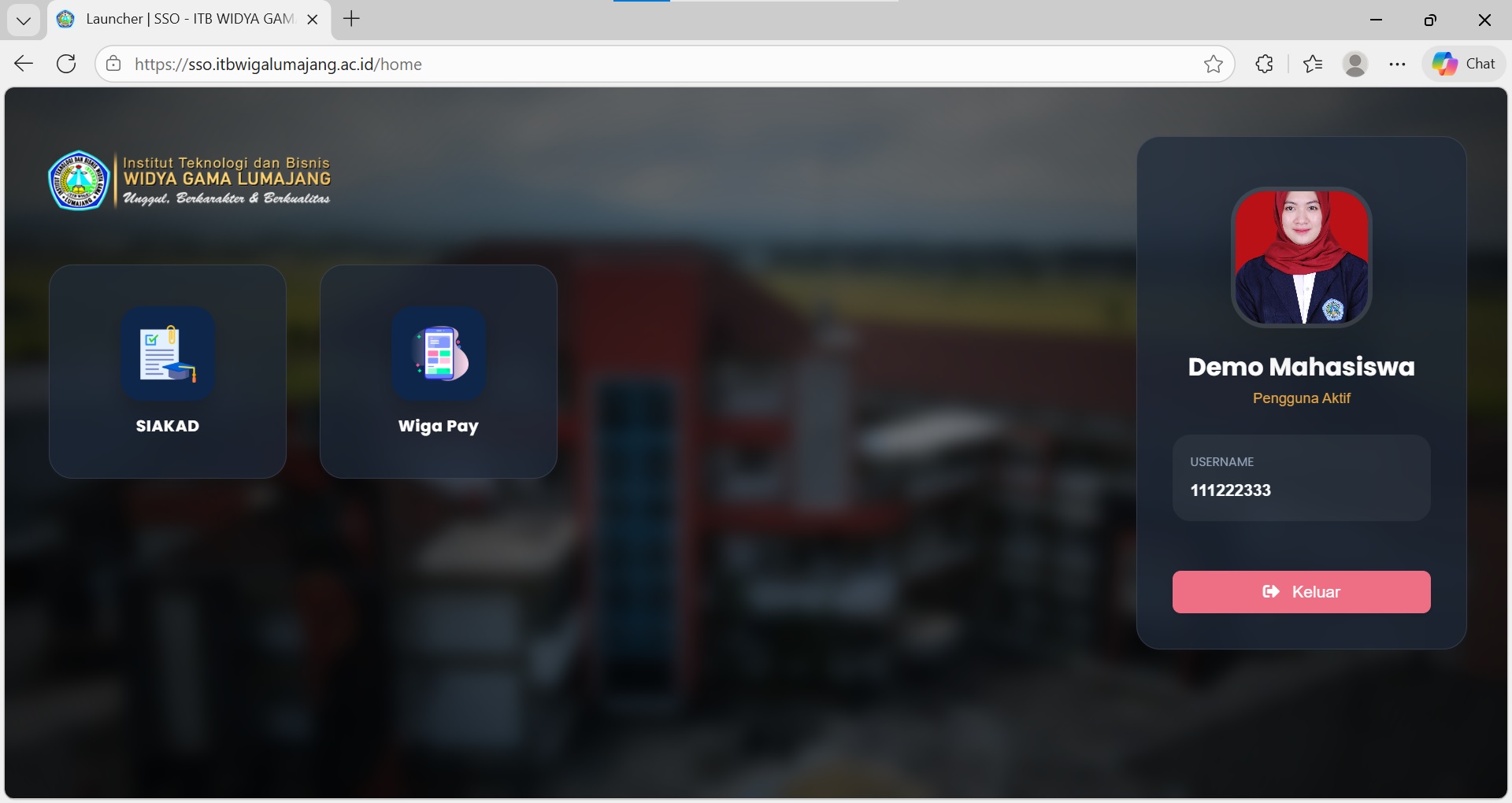 Setelah berhasil login, tampilan pertama adalah ekosistem aplikasi yang nantinya akan dikembangkan secara bertahap. Untuk sementara terdapat 2 aplikasi yang sudah siap digunakan oleh temen-temen mahasiswa untuk proses kegiatan akademik yakni Siakad (Sistem Informasi Akademik) dan Wiga Pay (Sistem informasi pembayaran kuliah) dilingkungan Institut Teknologi dan Bisnis Widya Gama Lumajang.