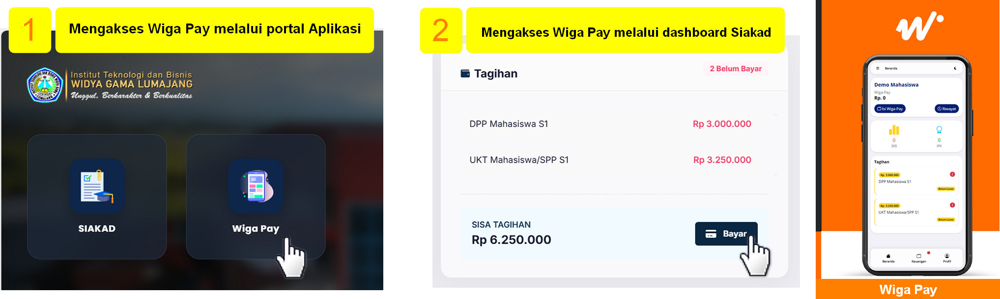 Untuk mengakses aplikasi Wiga Pay dapat melalui portal Wiga Mobile atau melalui halaman dasboard Siakad.
