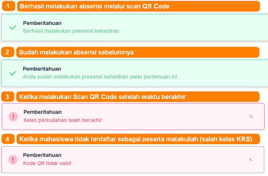Adapun nofitikasi setelah melakukan scan kode QR terdapat beberapa notifikasi sesuai dengan kondisi tertentu seperti pada gambar berikut: