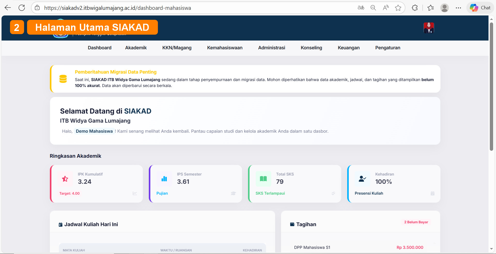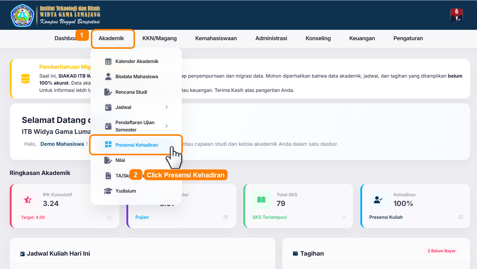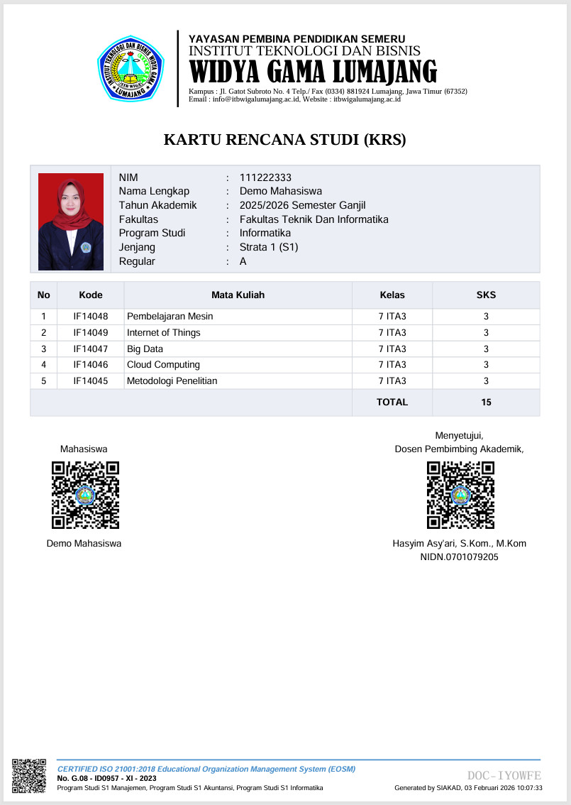 Pembayaran biaya kuliah dilingkungan Institut Teknologi dan Bisnis Widya Gama Lumajang mulai semester Genap tahun akademik 2025/2026 sudah memanfaatkan ekosistem digital Wiga Mobile. Dengan adanya Wiga Mobile, diharapkan proses administrasi keuangan menjadi lebih tertib serta mempercepat proses validasi pembayaran kuliah secara digital.