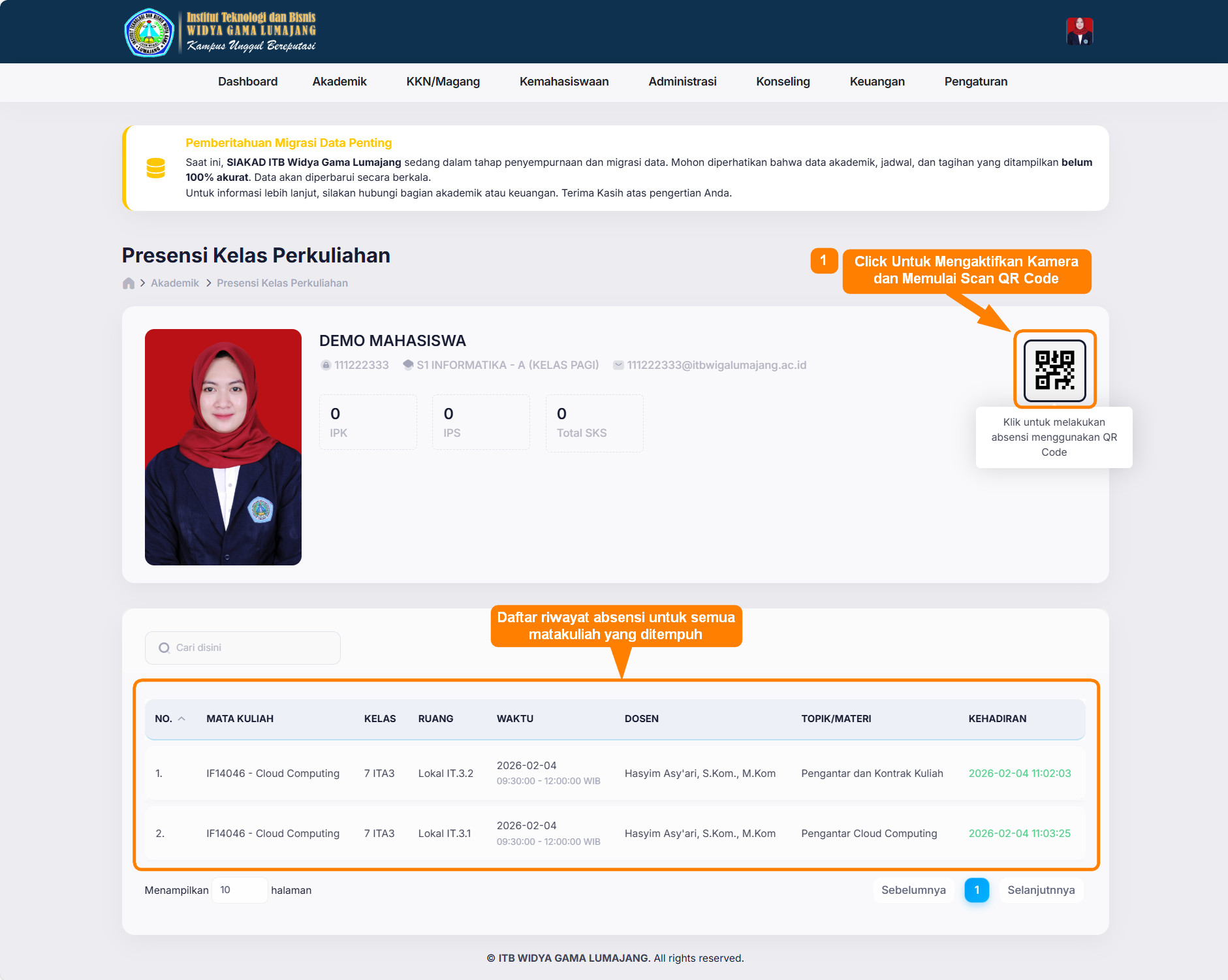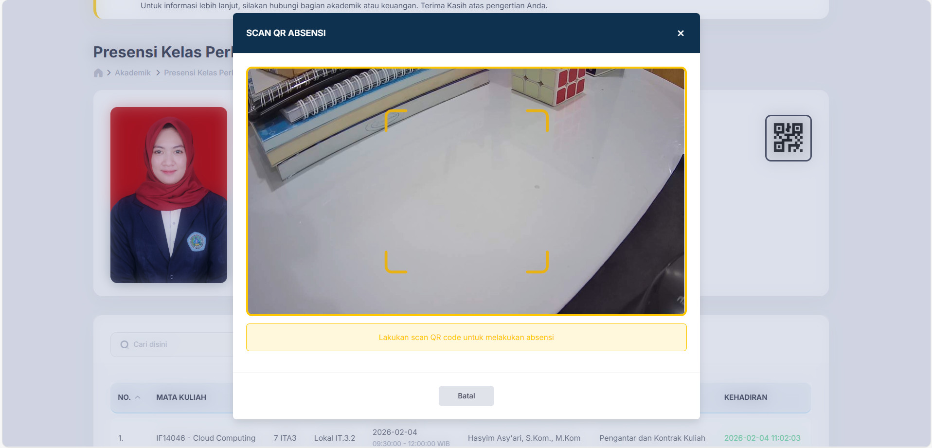 Pada halaman presensi kehadiran terdapat informasi tentang riwayat absensi perkuliahan yang sudah pernah dilakukan, selain itu juga terdapat fitur mengaktifkan kamera untuk scan QR Code. Untuk melakukan scan QR Code absensi perkuliahan seperti pada gambar berikut.