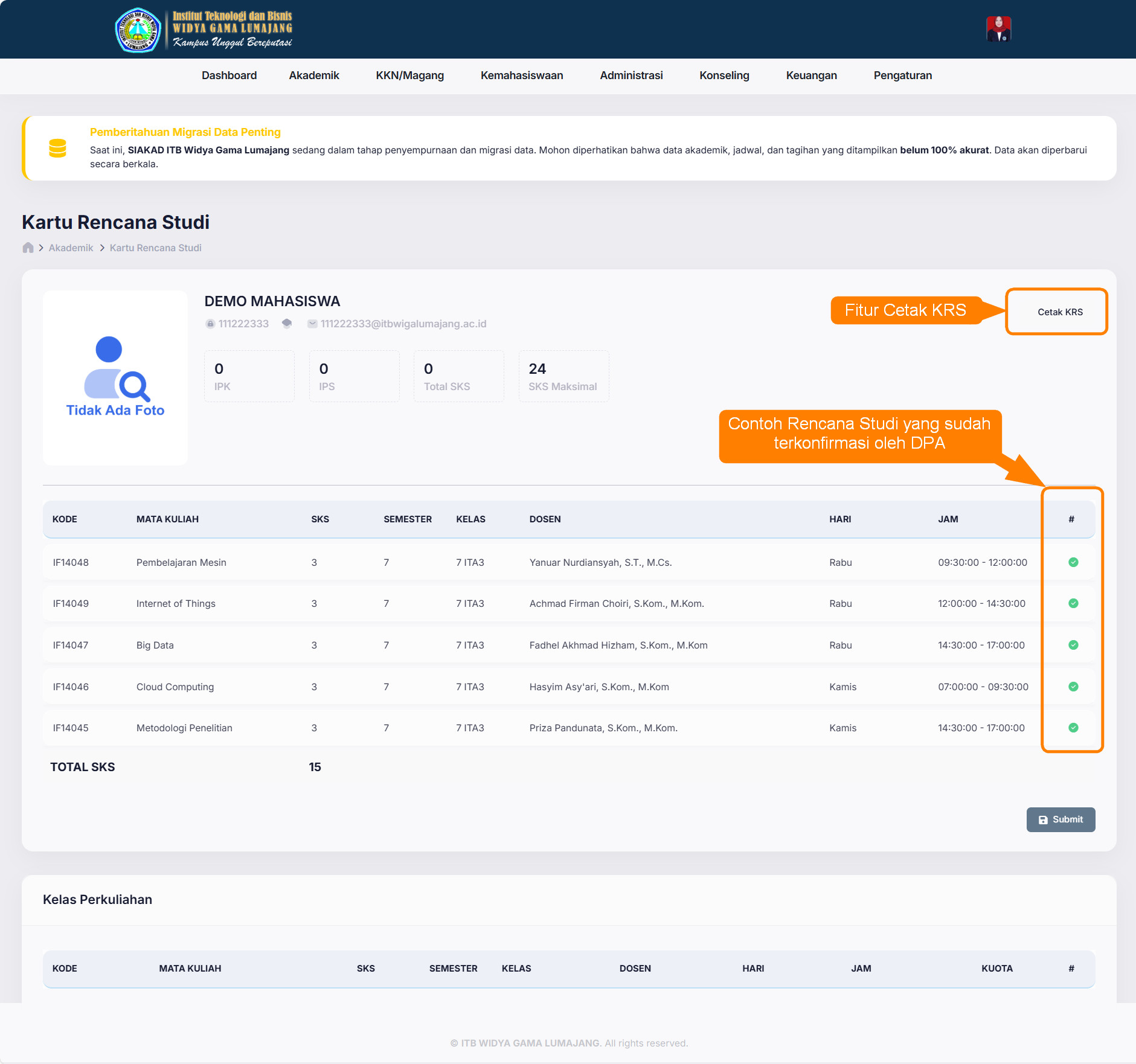 Penerapan absensi secara digital dengan memanfaatkan teknologi informasi memberikan perubahan pola absensi mahasiswa yang sebelumnya melakukan absensi tanda tangan secara manual, kini dengan Wiga Mobile proses absensi perkuliahan mahasiswa dilakukan dengan cara Scan QR-Code. Dimana QR-Code akan diinformasikan oleh masing-masing dosen pada saat perkuliahan berlangsung. Dengan adanya perubahan pola absensi secara digital mengharuskan dan menjadi wajib hukumnya bagi mahasiswa untuk taat pada proses administrasi akademik khususnya Rencana Studi meliputi programming Rencana studi tepat waktu, pemilihan kelas yang tepat, pembayaran kuliah sesuai ketentuan yang berlaku dan konsultasi perwalian yang tepat dikarenakan apabila terdapat kesalahan seperti pemilihan kelas akan berdampak terhadap tidak terecordnya absensi mahasiswa yang bersangkutan.