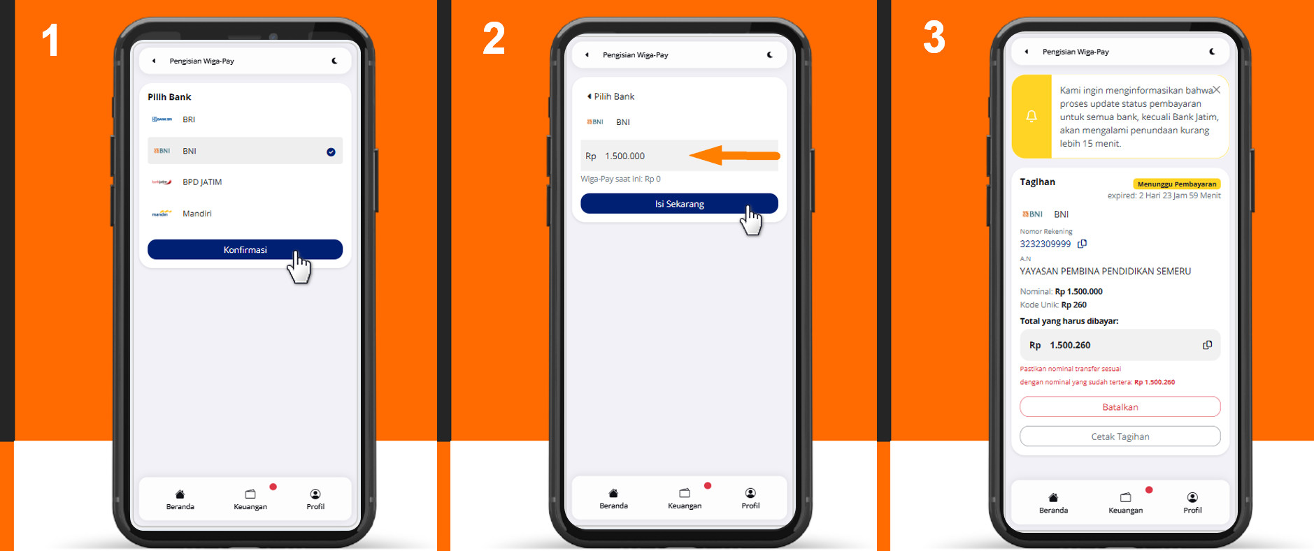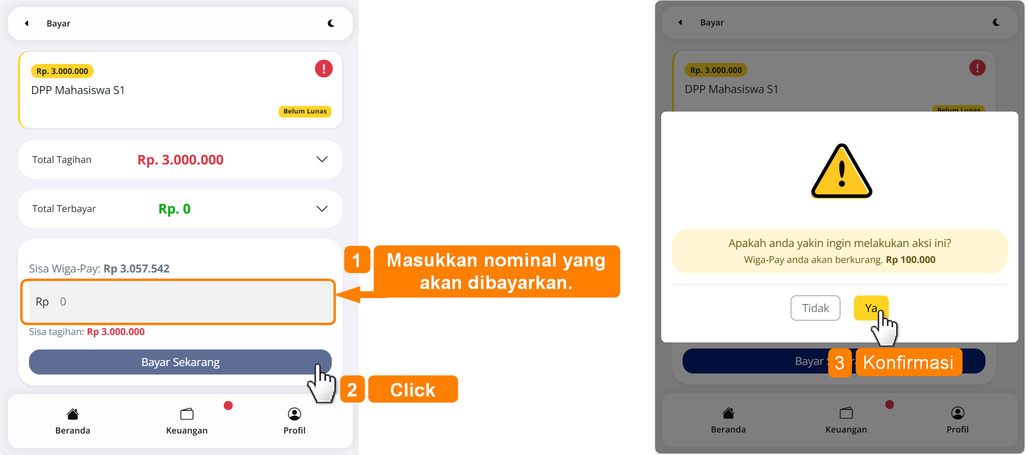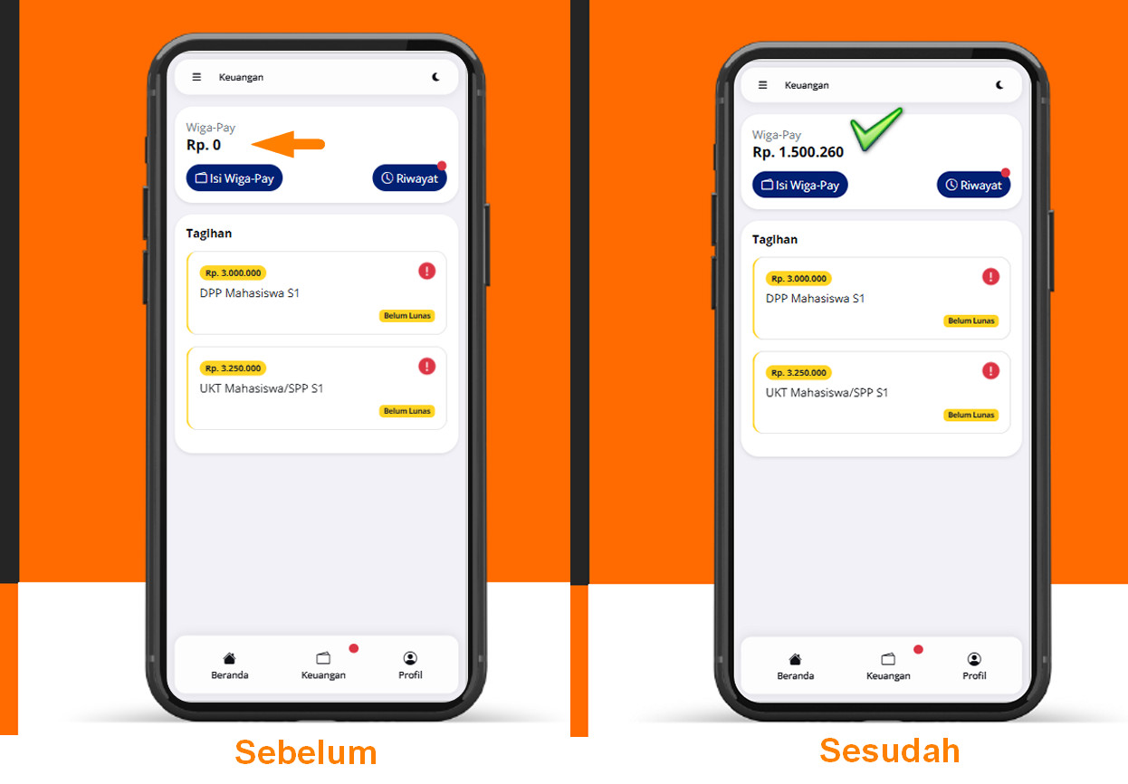 Pembayaran kuliah melalui Wiga Pay menerapkan 2 fase yaitu: