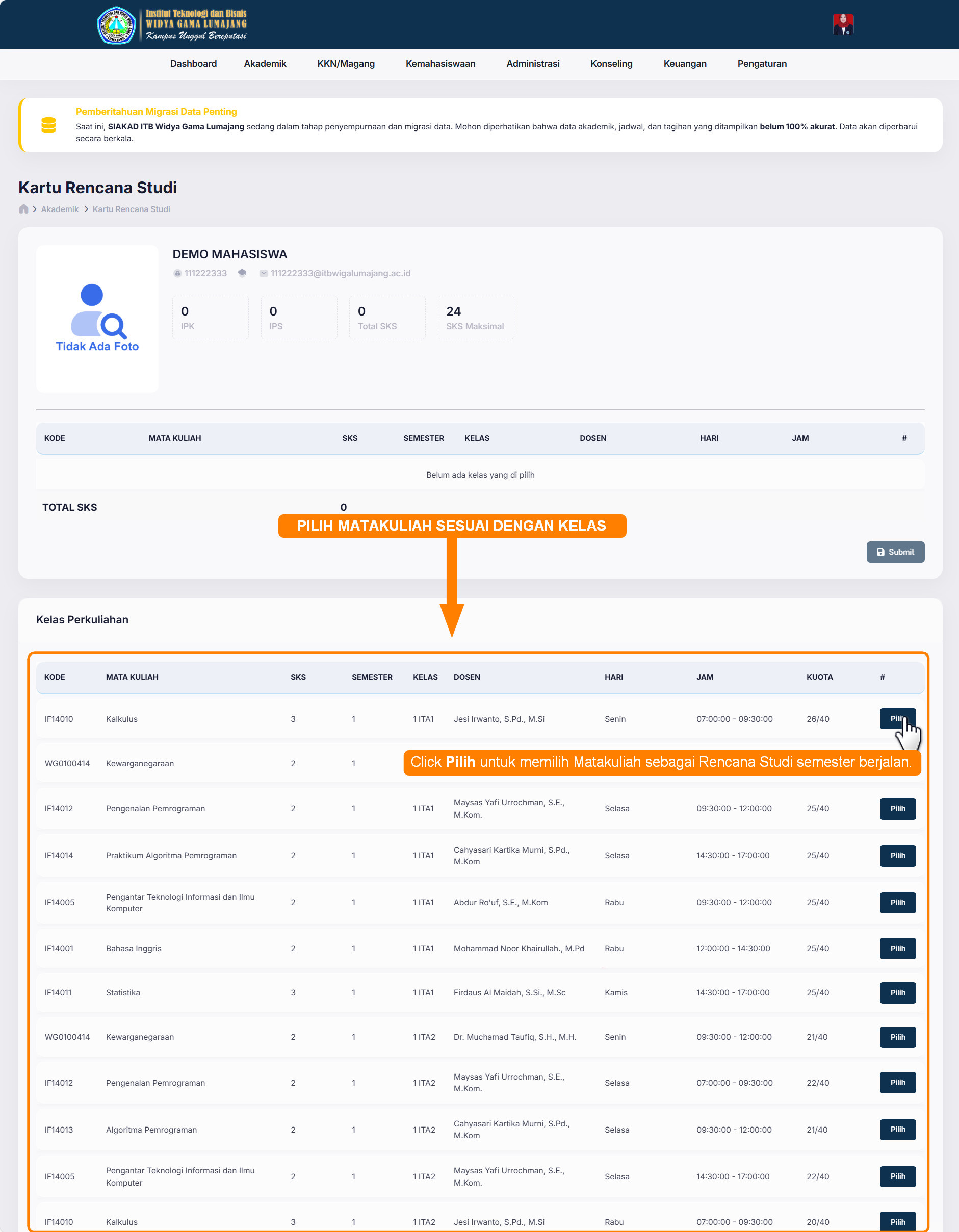 Pilih beberapa matakuliah yang sesuai dengan semester dan kelas, tekan tombol pilih untuk memilih matakuliah tersebut sebagai Rencana Studi pada semester berjalan.