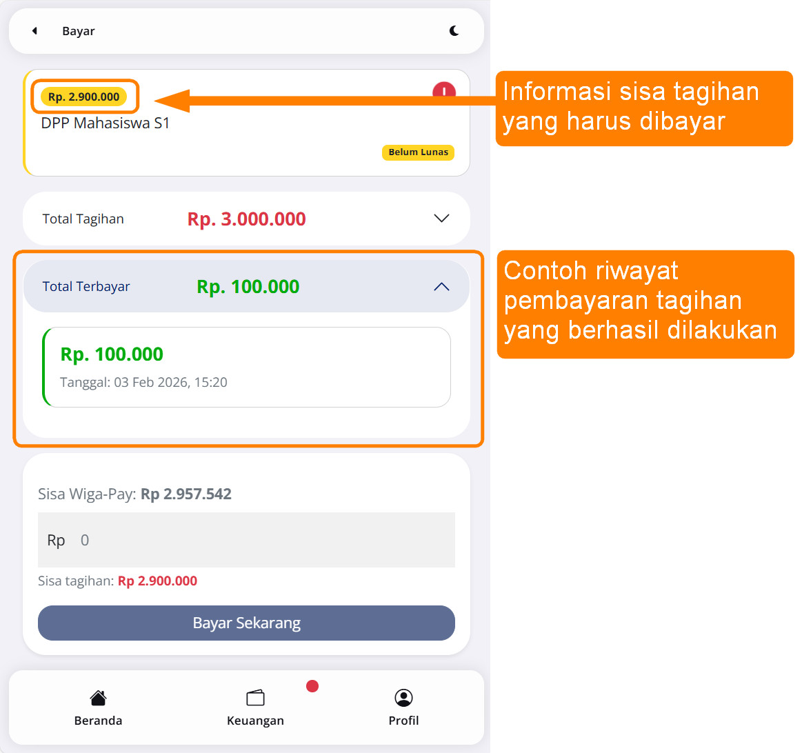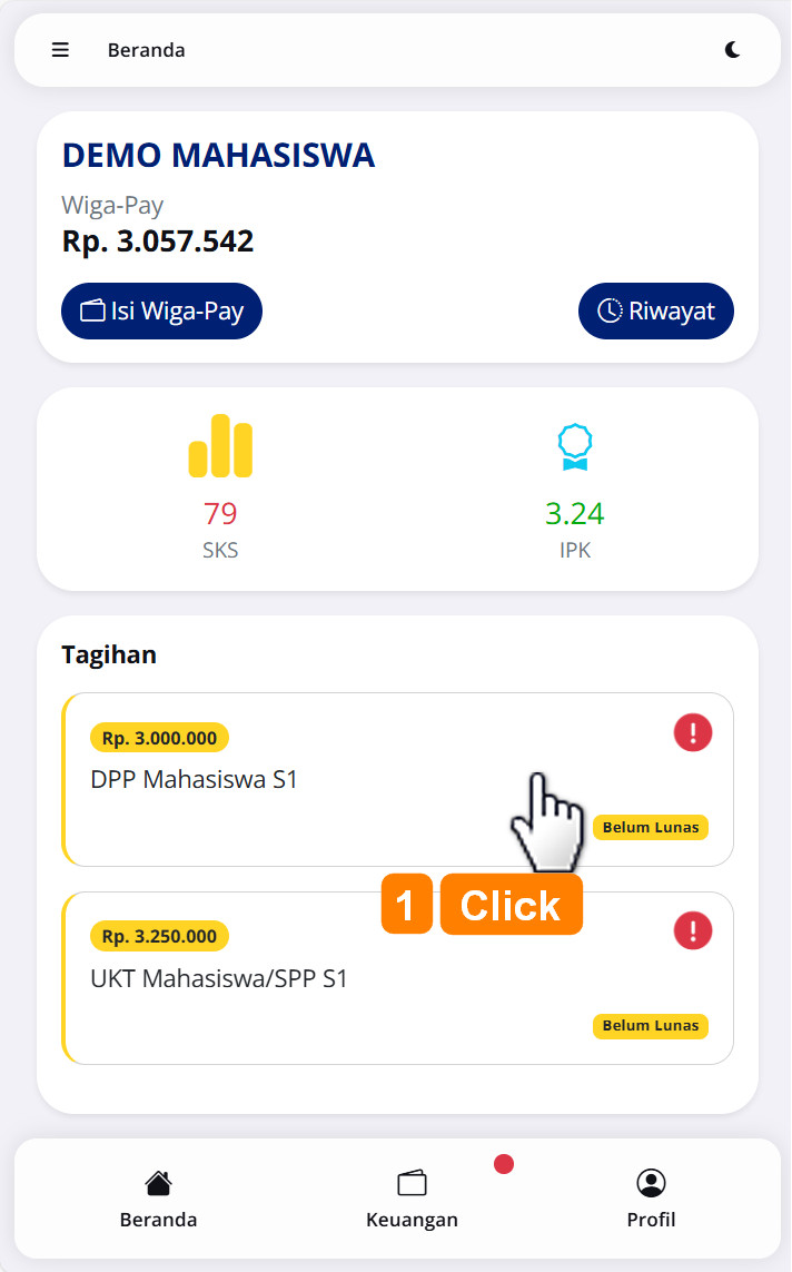 Informasi tagihan untuk setiap jenis pembayaran termuat pada halaman beranda maupun halaman keuangan, dimana terdapat keterangan belum lunas serta jumlah tagihan yang harus dibayar atau dilunasi. Untuk melakukan pembayaran atas tagihan tersebut silahkan pilih dan click pada tagihan tersebut seperti pada gambar berikut.