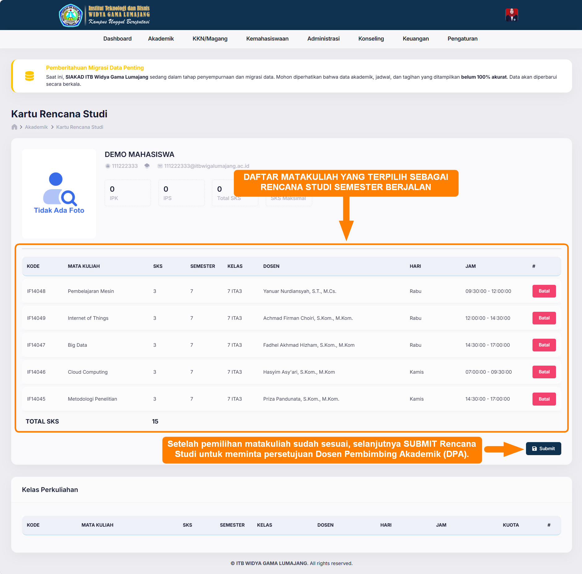 Ketika beberapa matakuliah sudah terpilih dan sudah sesuai dengan Rencana Studi yang akan ditempuh pada semester berjalan, selanjutnya tekan tombol SUBMIT untuk mengirimkan rencana studi tersebut kepada Dosen Pembimbing Akademik (DPA) untuk dilakukan konfirmasi persetujuan oleh masing-masing DPA.