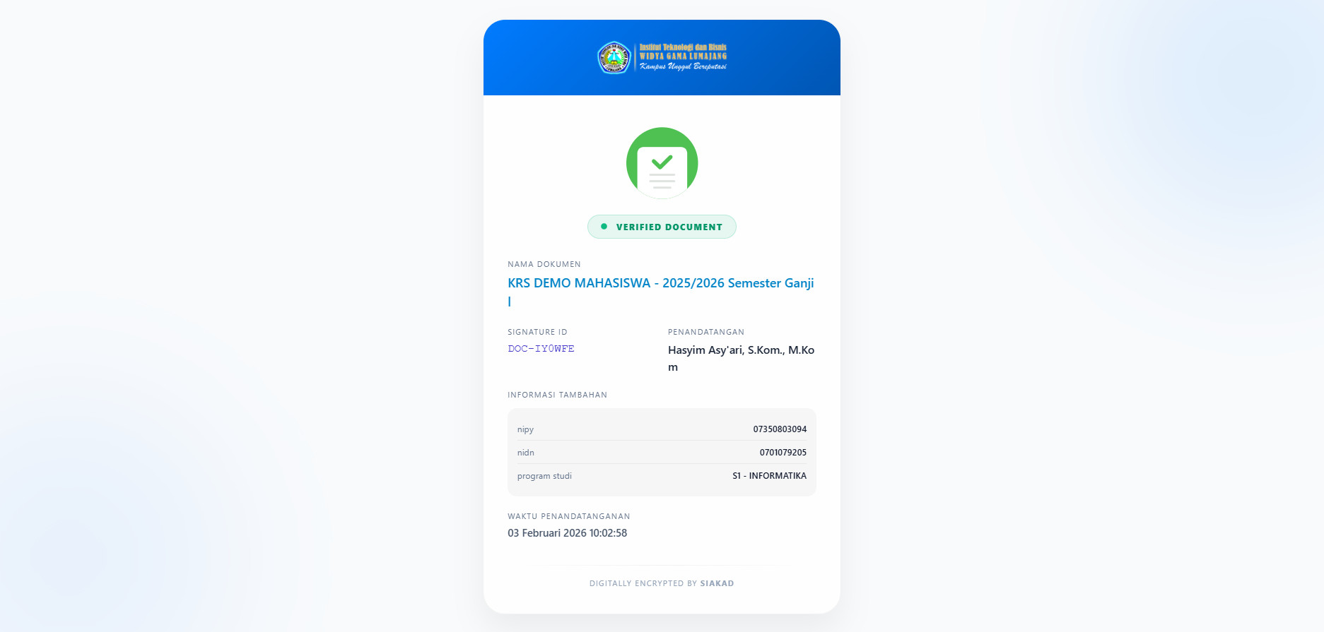 Print out rencana studi yang sudah terkonfirmasi akan tertandatangani secara digital dan untuk menjamin keasliannya QR-Code tersebut ketika discan maka akan menampilkan beberapa informasi seperti pada gambar berikut.